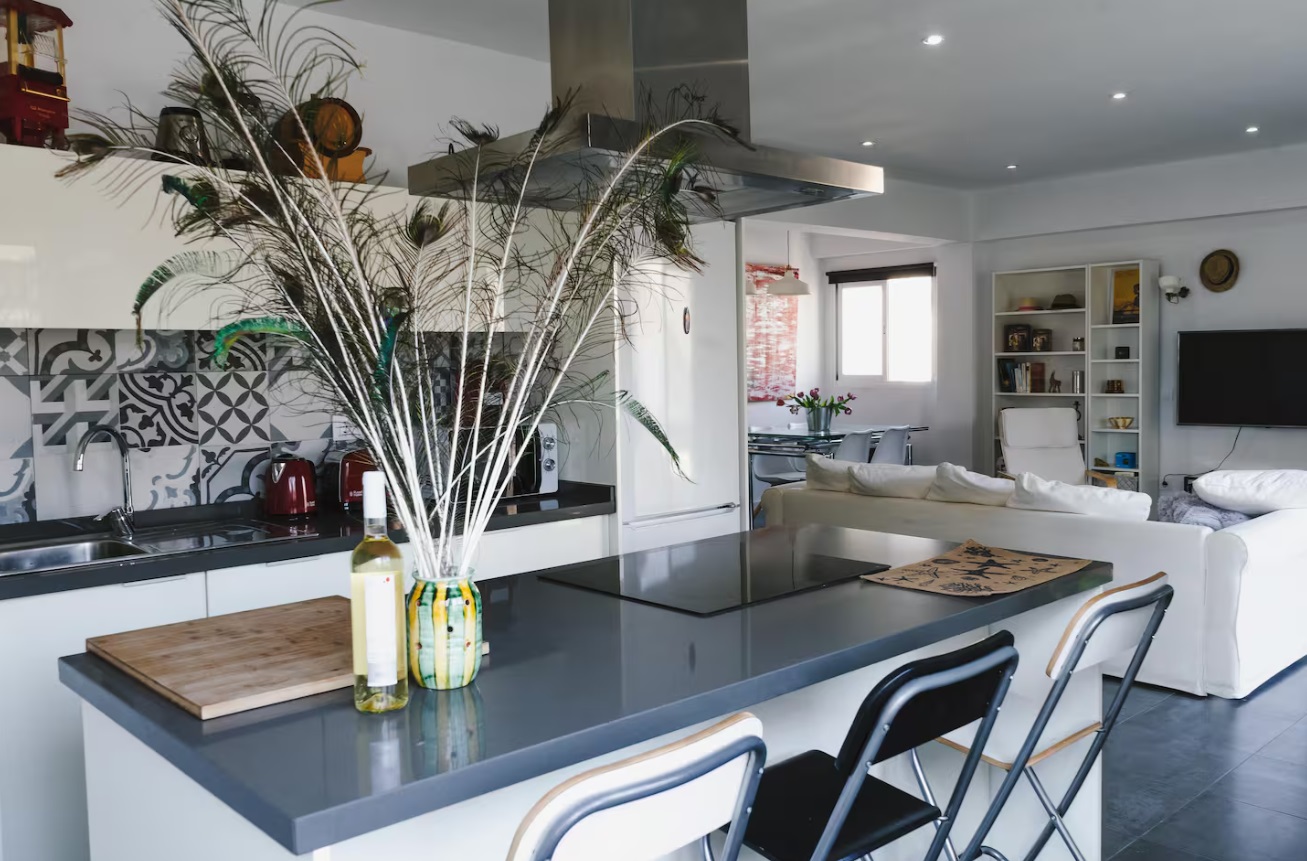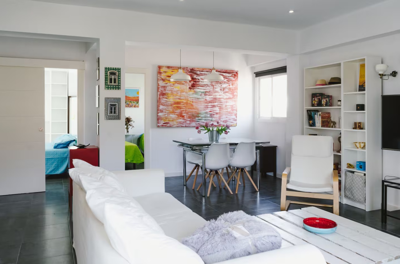 Está decorado con obras de arte de algunos artistas almerienses, que reproducen los principales puntos turísticos, fíjate y podrás reconocer algunas playas del cabo de gata e incluso la fachada de la catedral. Dispone de un salón de mas de 50 metros con cocina abierta con todo lo necesario para poder cocinar. Vitrocerámica, horno, lavavajillas, microondas , tostadora , maquina de palomitas, hervidora de agua, así como sartenes , cubiertos, ollas y menaje.