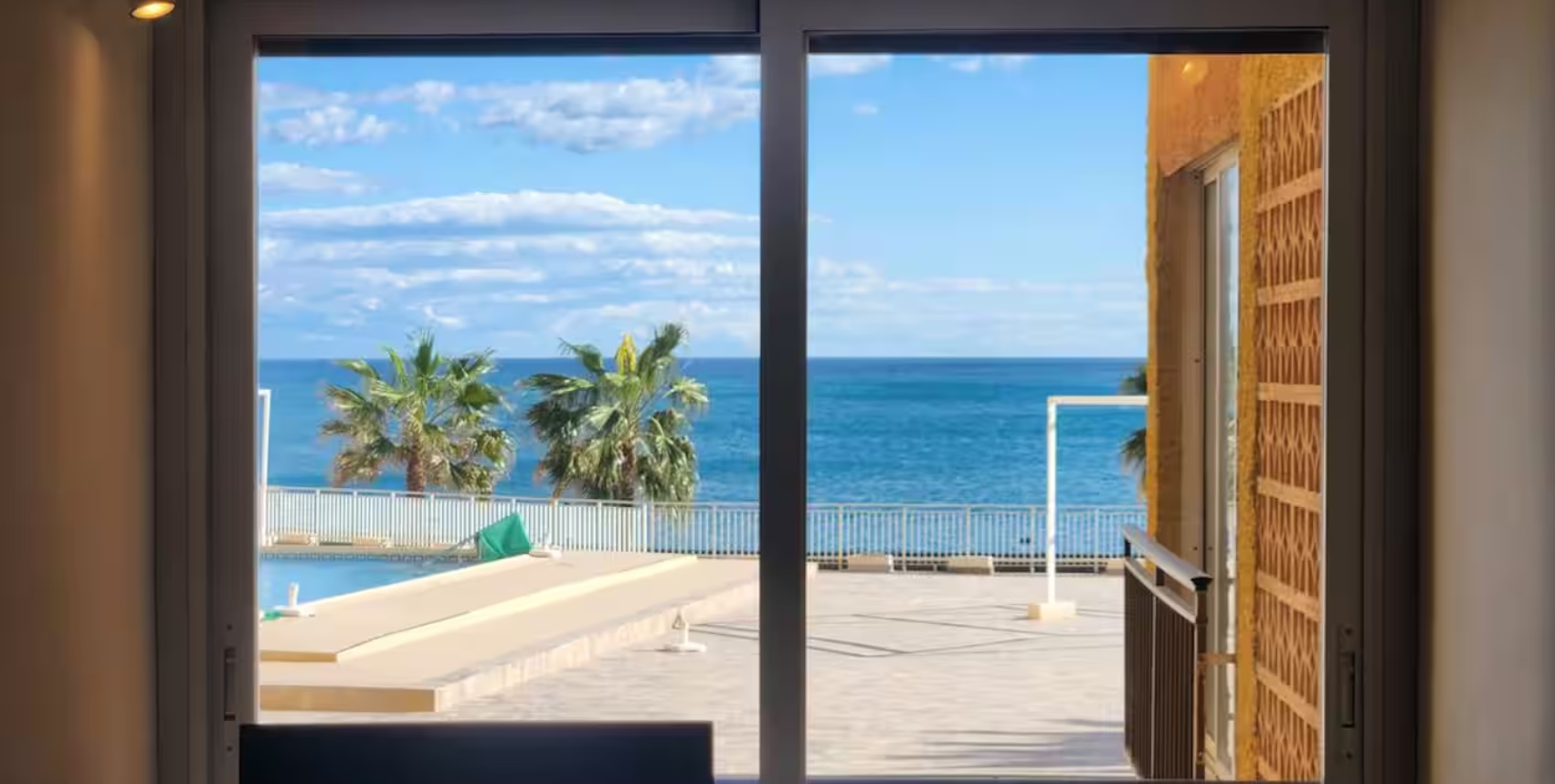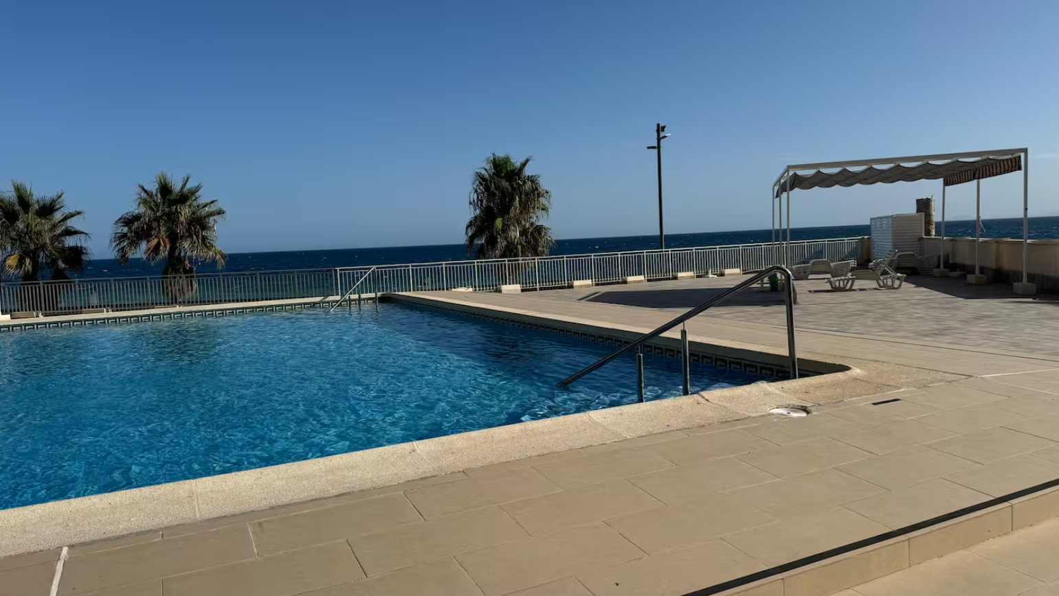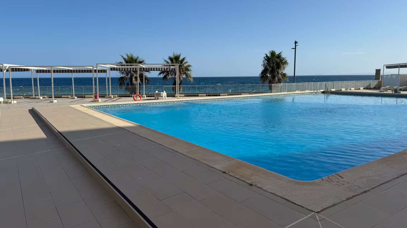 Amplio balcón con vistas al mar para disfrutar del mar y de los alrededores. Piscina abierta en temporada.
