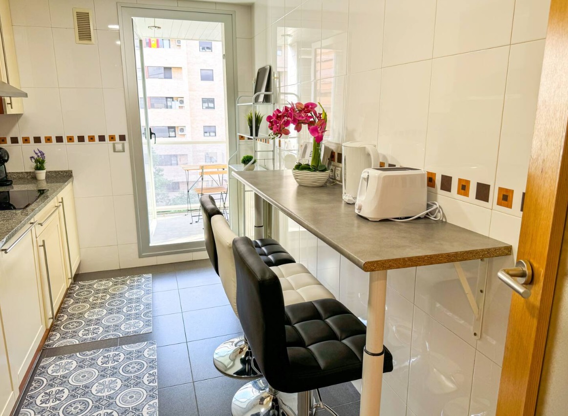Amplio salón-cocina donde descansar, cocina totalmente equipada. Con Wifi, Smart TV y espacio para trabajar, terraza para tomar el sol. Cuenta con Piscina Comunitaria. Decorado y amueblado recientemente con las mejores calidades para su disfrute. Excepcional apartamento, perfectamente ubicado y equipado. Este espacioso alojamiento ofrece cuatro habitaciones y dos baños, junto con un amplio salón-cocina donde podrás descansar y compartir momentos especiales. La cocina totalmente equipada te permite preparar comidas caseras con facilidad, mientras que el Wifi de alta velocidad y la Smart TV garantizan entretenimiento y conectividad constante. Además, hay un cómodo espacio de trabajo para quienes necesiten mantenerse productivos durante su estancia. Está estratégicamente ubicado en un barrio tranquilo y bien conectado, con fácil acceso a tiendas locales, restaurantes y transporte público.