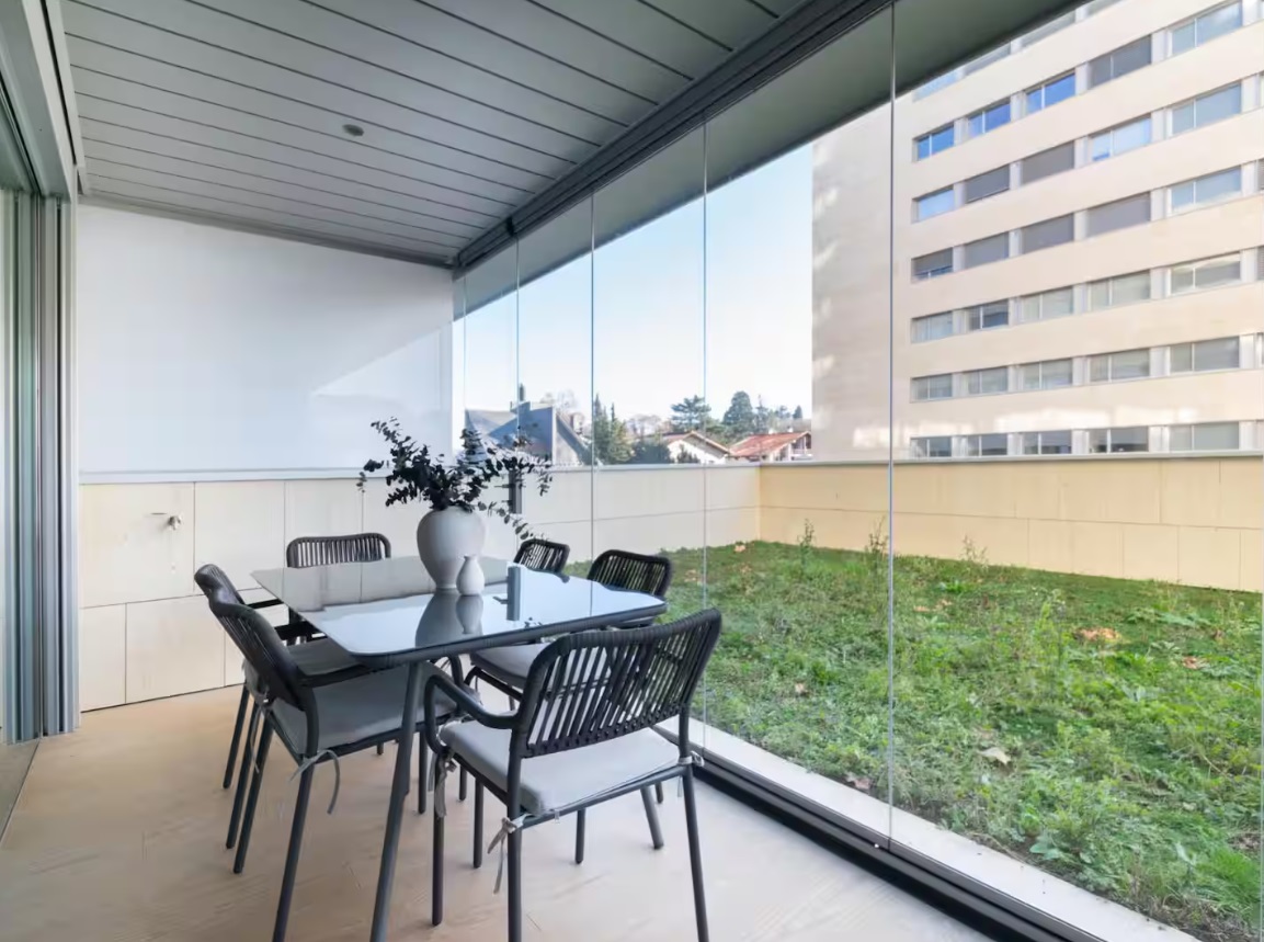 Este singular apartamento en primera planta cuenta además con 50 m² de jardín privado y una terraza. Las instalaciones del edificio incluyen un gimnasio y dos pequeñas piscinas al aire libre en la azotea.