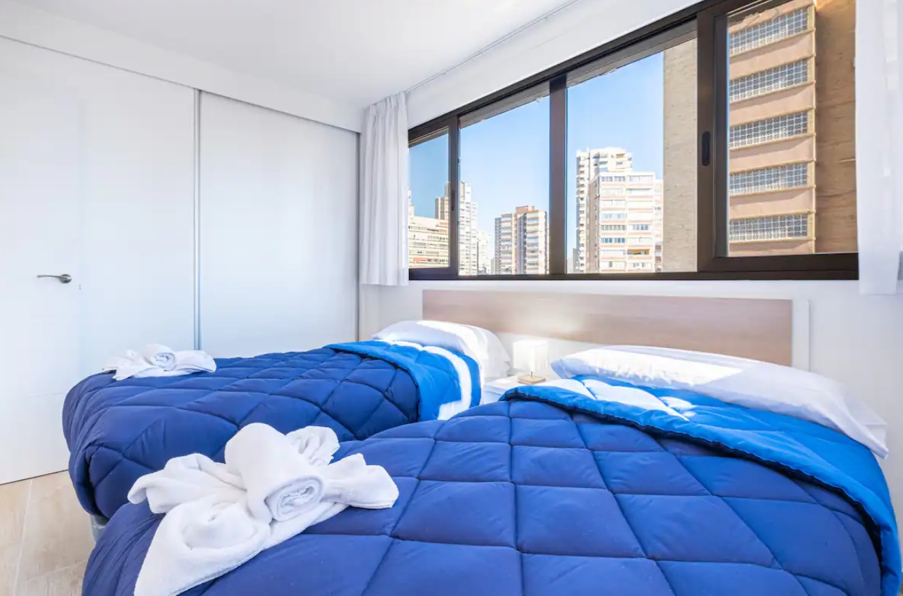 Apartamento reformado a escasos metros de la playa Levante y del casco antiguo de Benidorm. Posee 2 dormitorios, dos cuartos de baño con ducha (principal en suite) y capacidad para 6 personas.