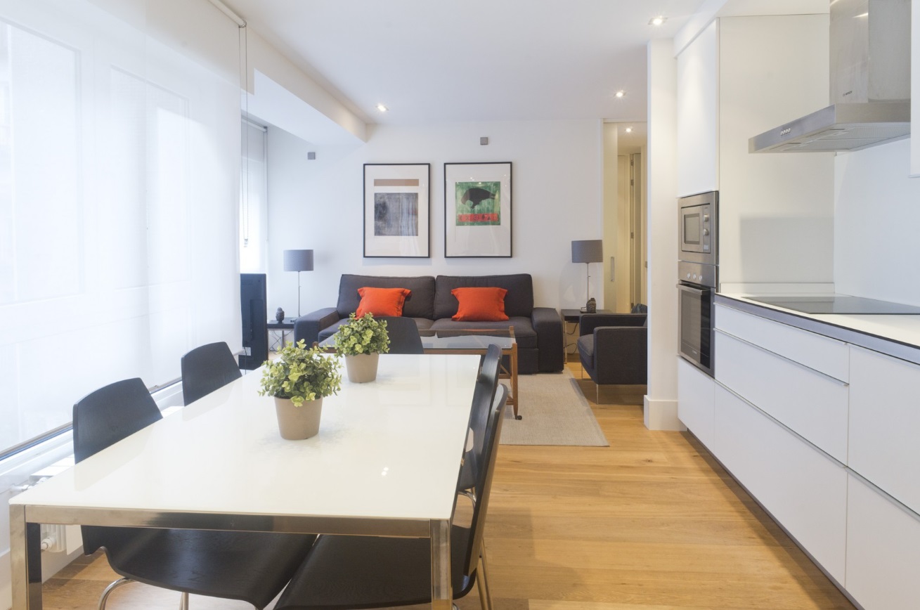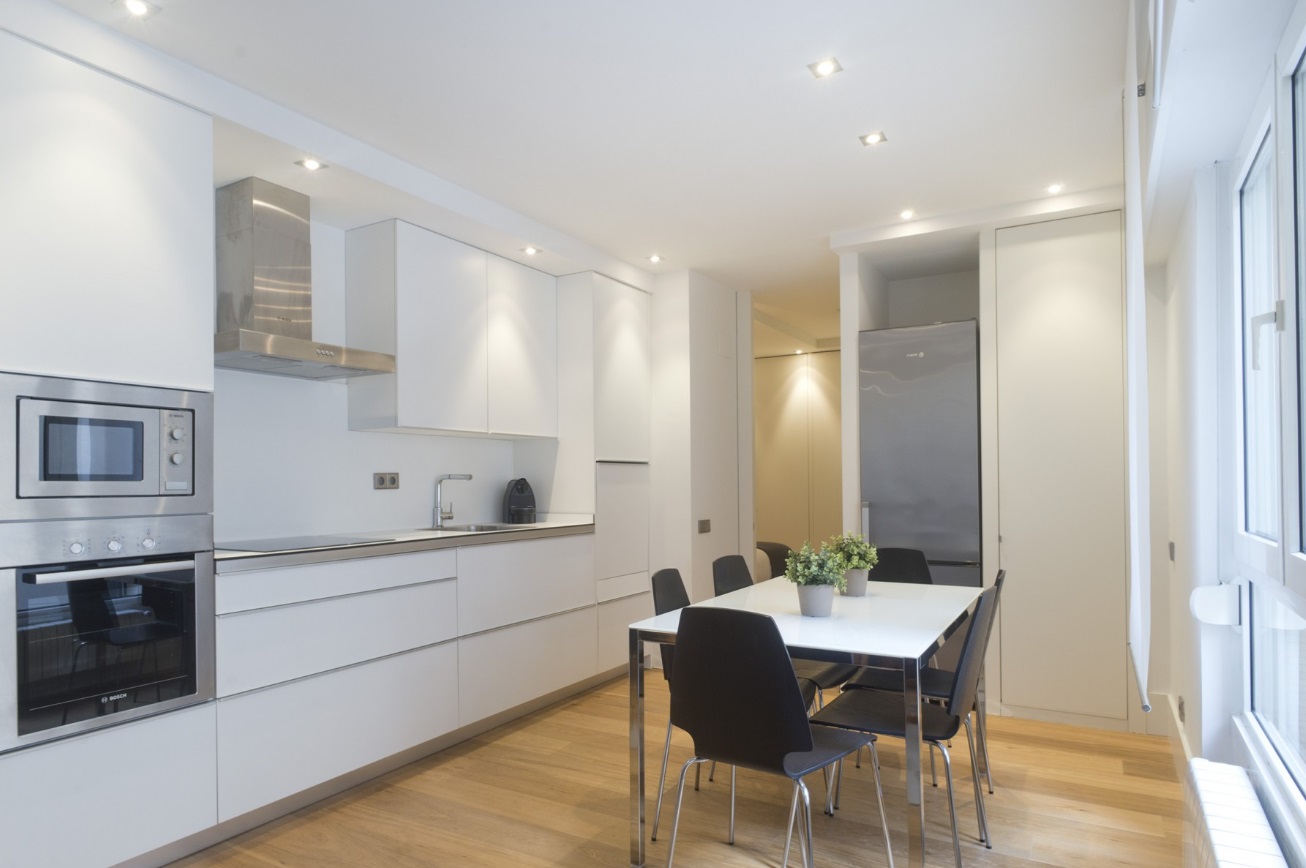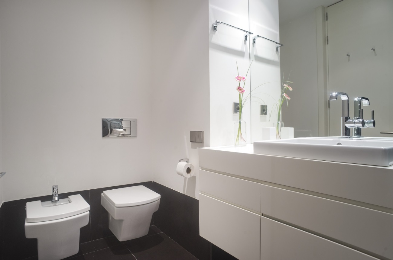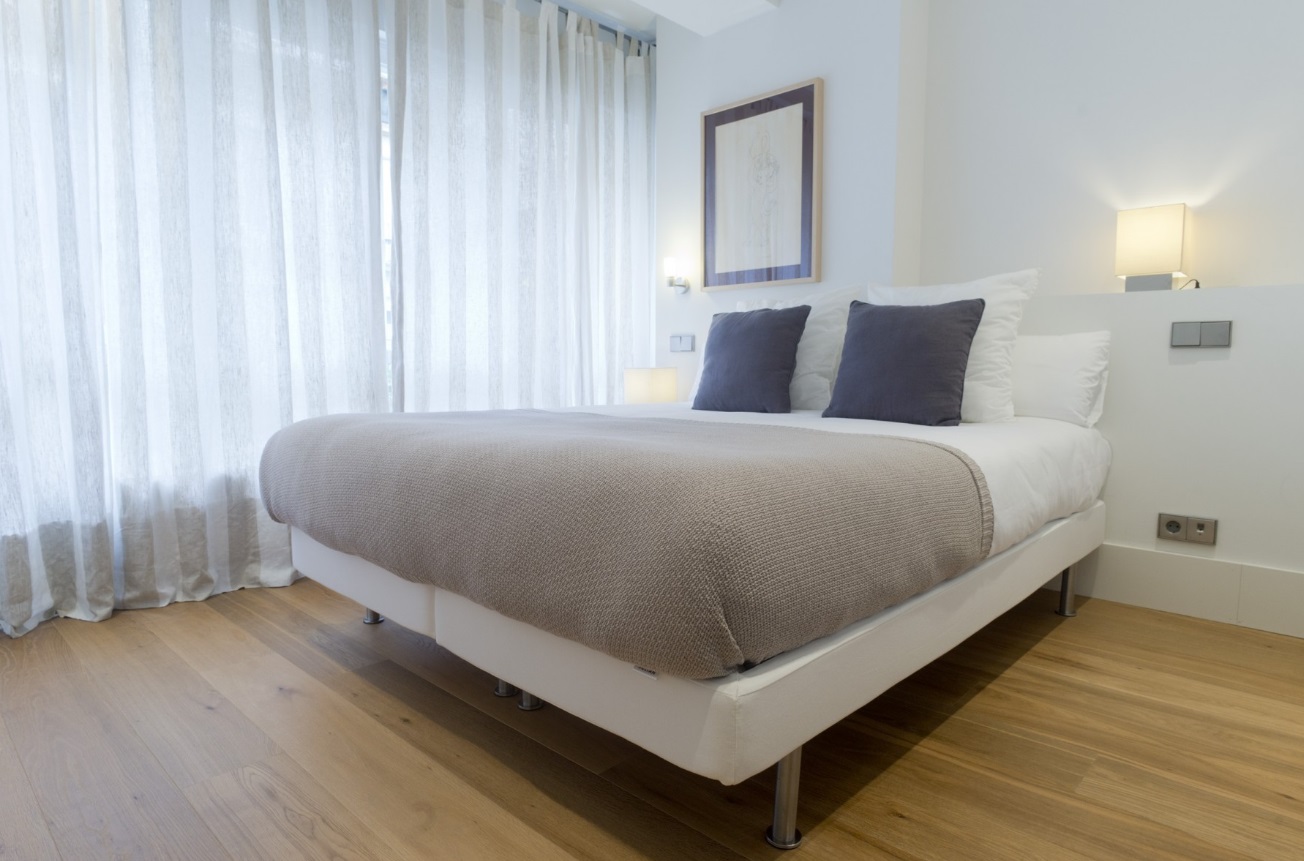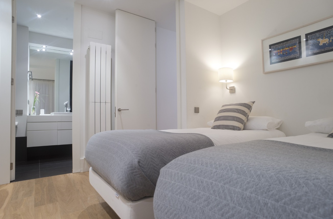 El apartamento cuenta con todo tipo de comodidades. Está orientado a un amplio y luminoso patio de manzana y ocupa la segunda planta de un edificio con ascensor. Cuenta con dos dormitorios dobles, un moderno salón-comedor, dos cuartos de baño con amplios platos de ducha y una espaciosa cocina abierta, equipada con electrodomésticos de alta gama y menaje de cocina completo. El dormitorio principal dispone de una cama de matrimonio de 160 cm y el otro ofrece dos camas individuales de 90 cm. Los dos cuartos de baños están incorporados en los dormitorios. Es perfecto para una pequeña familia o dos parejas de amigos. Este apartamento dispone de parking privado.