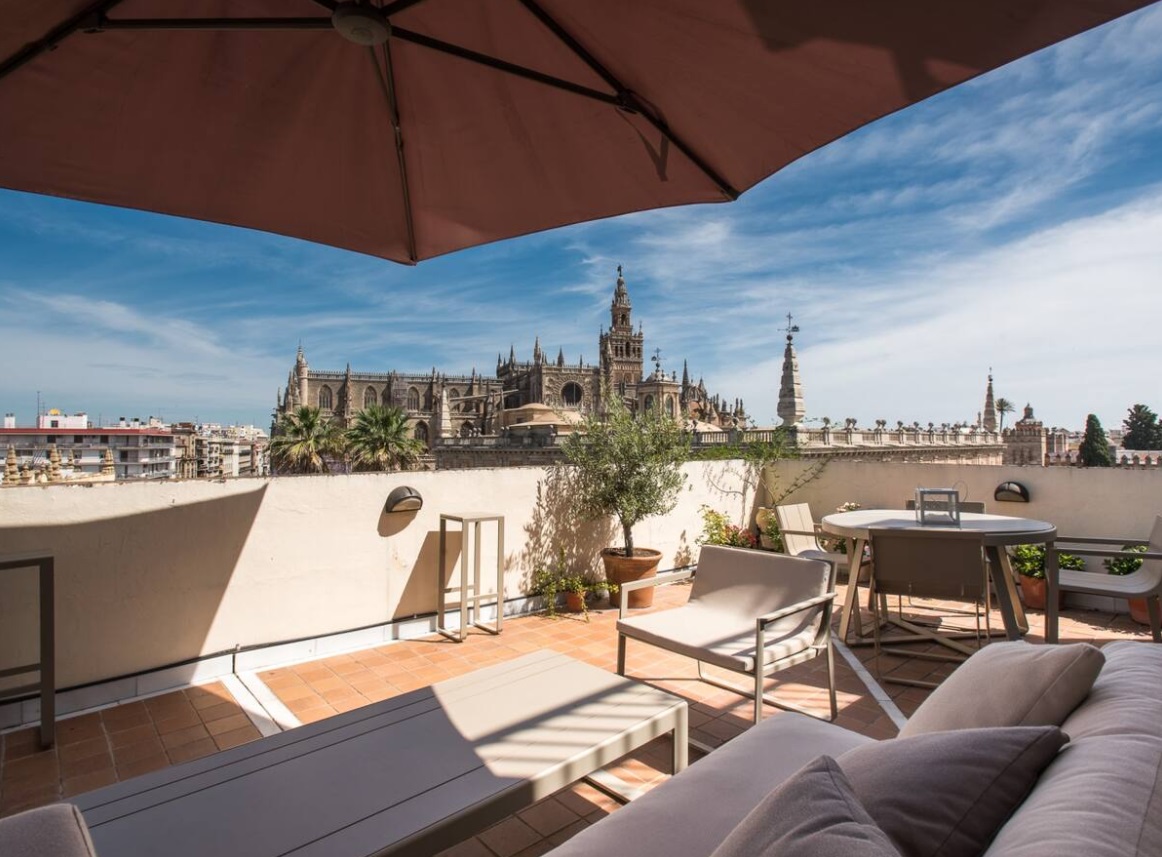 Cuenta con 140 m2 distribuidos en dos dormitorios con baños en suite, amplio salón diáfano con salida directa a la terraza, aseo de cortesía con acceso desde salón y cocina totalmente equipada.El salón, con vistas desde todos los ángulos a la Giralda y la Catedral, cuenta con sofá de diseño de grandes dimensiones, televisión de 55 pulgadas, equipo de sonido de alta fidelidad Sonos, y sistema Apple TV para disfrutar de todo tipo de contenidos. Asimismo cuenta con una mesa de comedor para 6 comensales.La terraza panorámica de 40 m2, a la que se accede desde el salón a través de tres grandes vanos abalconados, cuenta con vistas excepcionales e inéditas de la zona monumental de la ciudad. Dispone de una zona lounge con sofás y mesa baja para momentos de relax, una zona de comedor con capacidad para cuatro comensales y una zona de solárium con hamaca y ducha para tomar el sol y refrescarse en los días de calor.