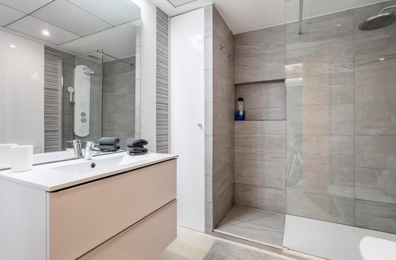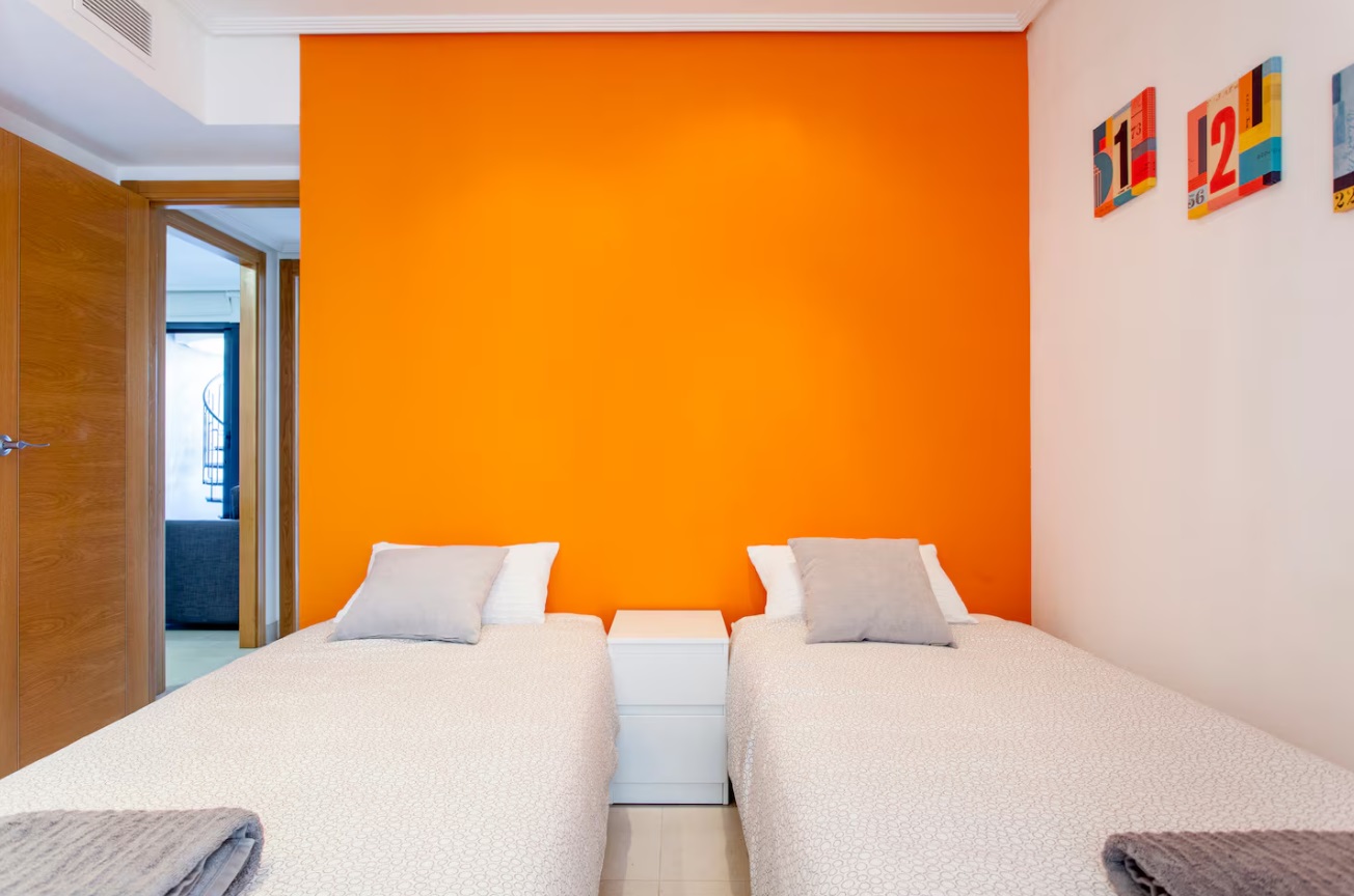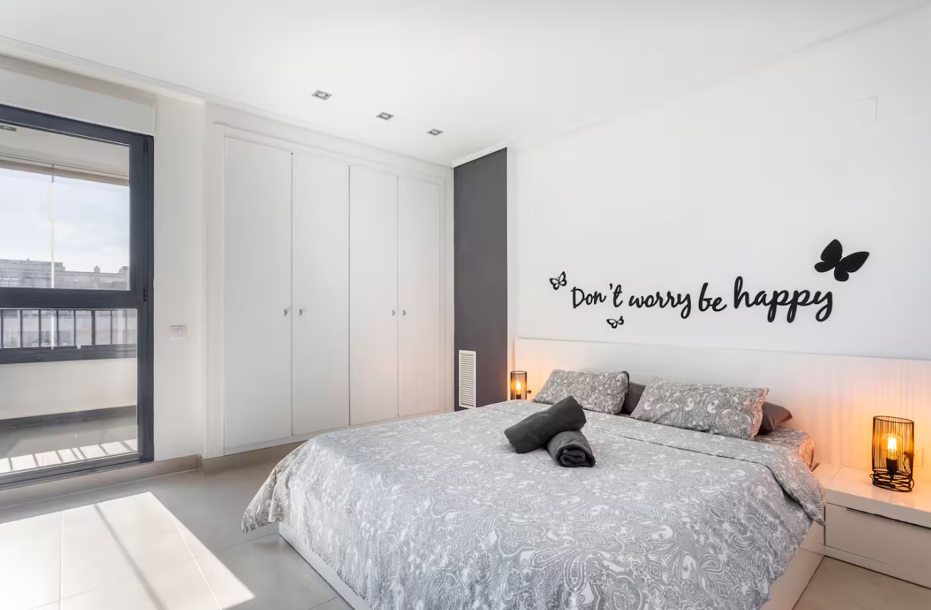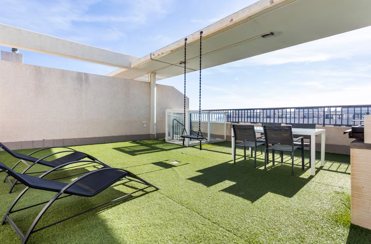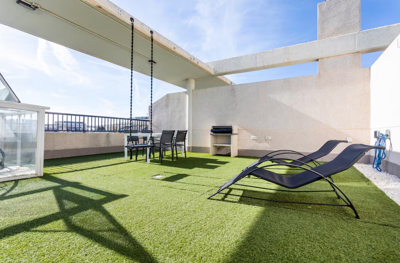 Es espacioso, cómodo y muy luminoso. También hay una parada de autobús para el centro justo al lado. Mercado y farmacia próximo. El complejo incluye conserjería 24 horas, plaza de garaje, piscina para adultos y niños, pistas de pádel y parque infantil. Cuenta con secador de pelo, lavavajillas, cafetera y otros electrodomésticos para su comodidad. Apartamento acogedor con un dormitorio con cama doble y otro con dos camas individuales. Incluye ropa de cama completa y toallas de baño, rostro y playa. La cocina está totalmente equipada con ollas, cubiertos, microondas, lavavajillas, mixer, tostadora y cafetera Nespresso. El apartamento cuenta con aire acondicionado central (frío y calor) y Smart TV con Netflix. En la planta inferior hay un espacio exterior con mesa y silla. En la planta superior, una terraza exclusiva con tumbonas, mesa, parrilla y una vista espectacular.