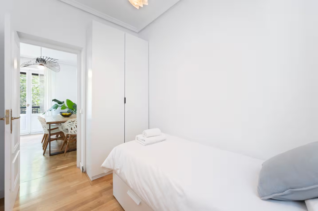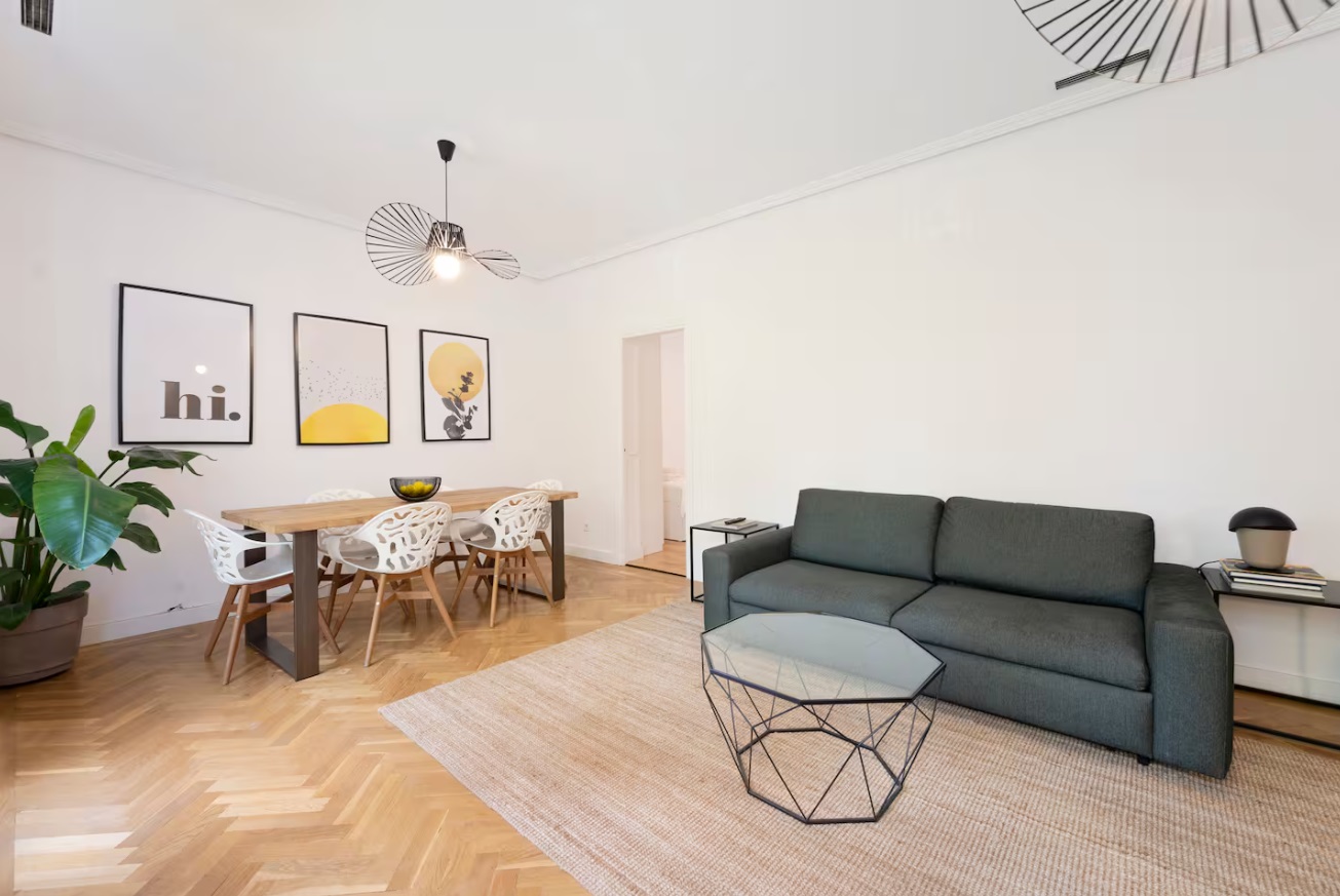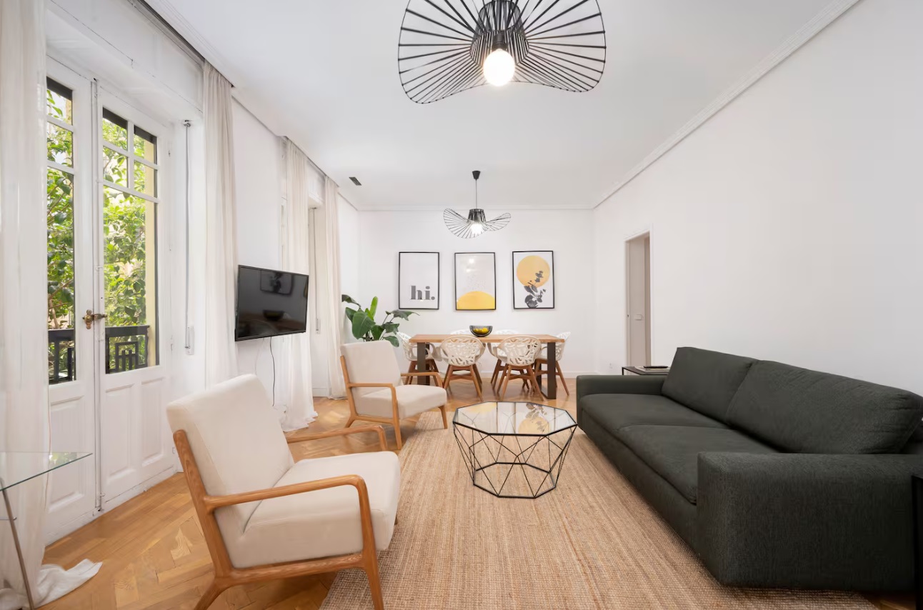 Es un piso señorial, espacioso y lleno de luz, decorado con elegancia y sencillez. El salón-comedor es muy luminoso y tiene dos balcones que dan a la calle Lope de Rueda. El comedor tiene capacidad para seis comensales. El apartamento dispone de dos dormitorios, el principal con cama matrimonial de 1,60 cm. El segundo dormitorio tiene dos camas de 90 cm cada una, y un sofá que se convierte en una cama de 1,40 (queen size).