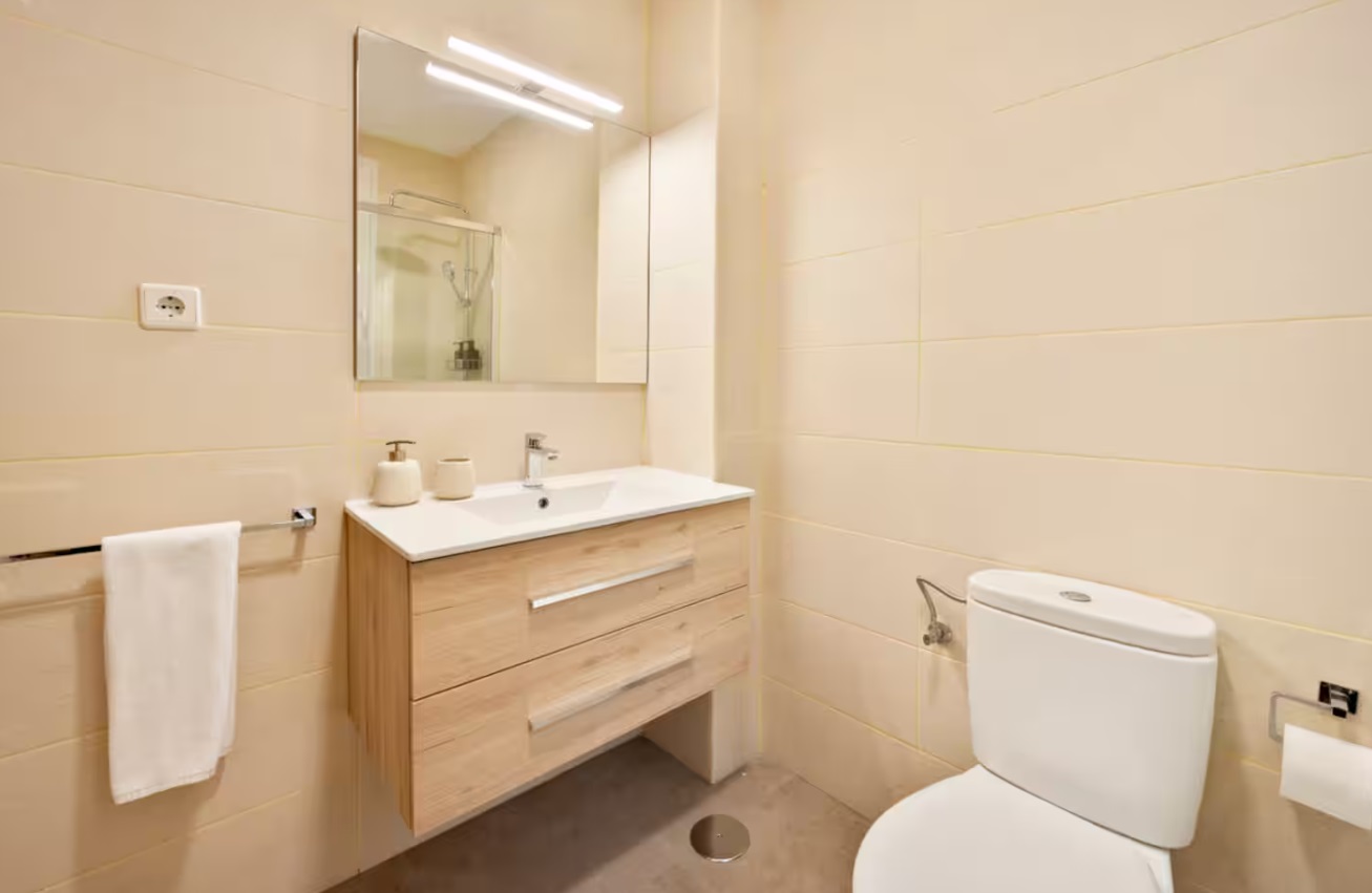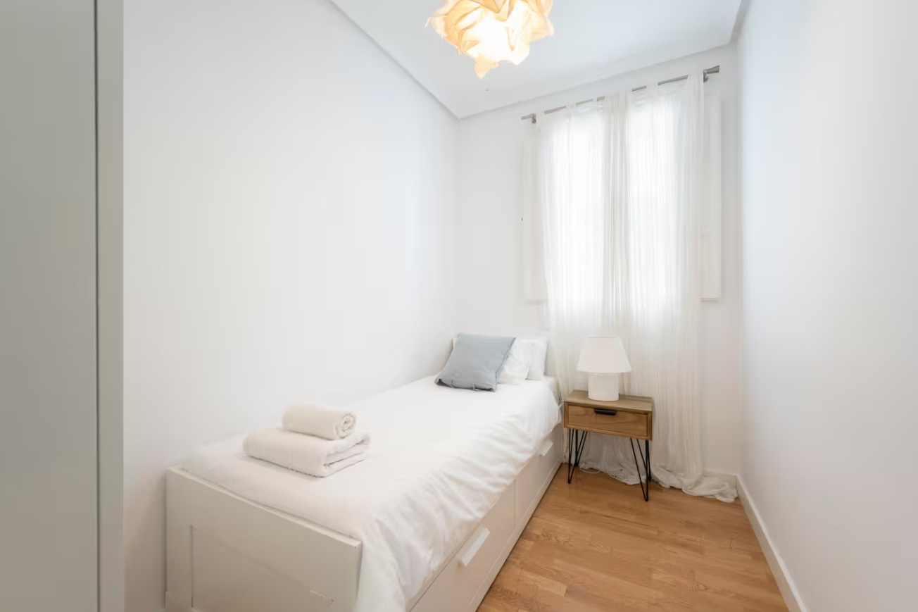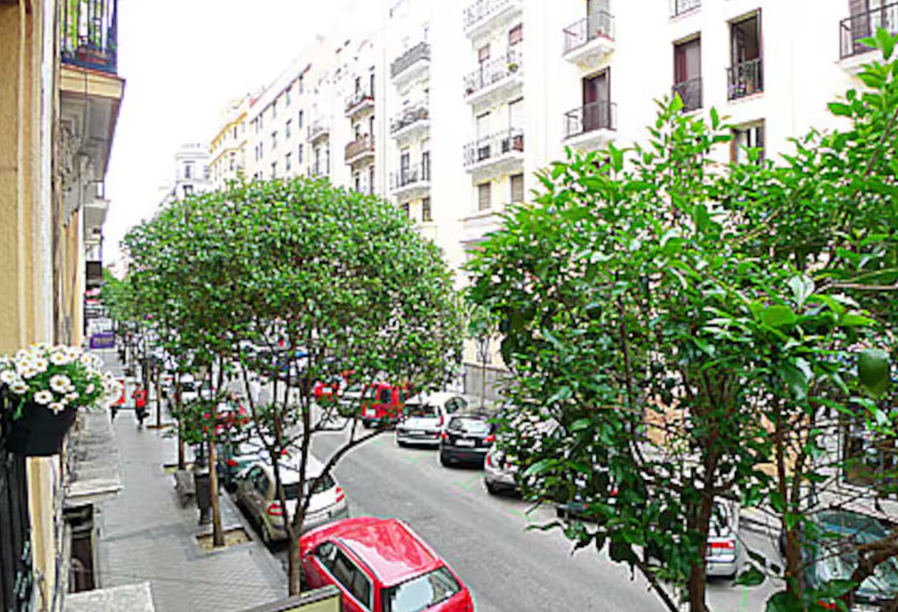 Es un piso señorial, espacioso y lleno de luz, decorado con elegancia y sencillez. El salón-comedor es muy luminoso y tiene dos balcones que dan a la calle Lope de Rueda. El comedor tiene capacidad para seis comensales. El apartamento dispone de dos dormitorios, el principal con cama matrimonial de 1,60 cm. El segundo dormitorio tiene dos camas de 90 cm cada una, y un sofá que se convierte en una cama de 1,40 (queen size).