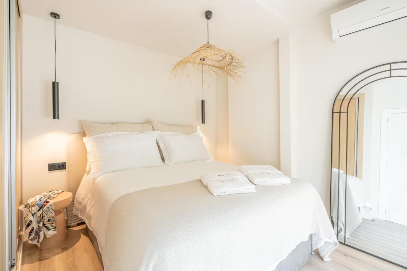 Habitación principal con cama de 150X200 cm, colchón alta calidad de viscolàstica, grandes ventanales frente a la playa, a/a y balcón.