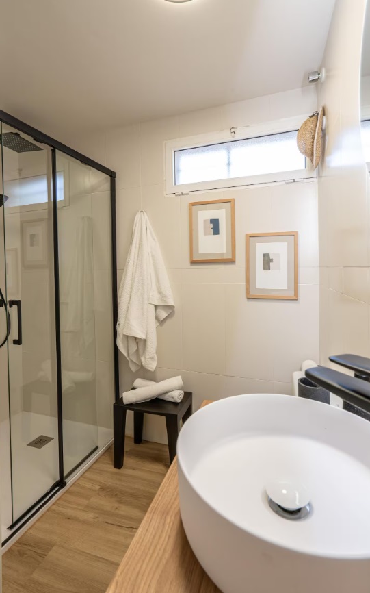 Baño con plato de ducha y termo eléctrico de 80litros ( 25’ de ducha). Salón con cocina americana, a/a , grandes ventanales frente a la playa y balcón. TV con canales por cable internacionales, cine, infantil y deportes., Wifi alta velocidad.