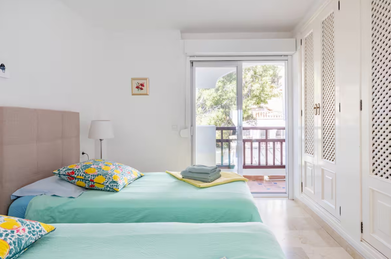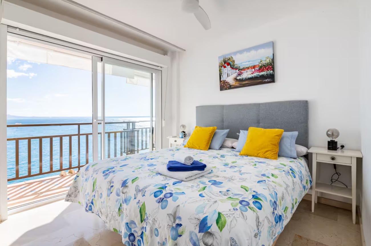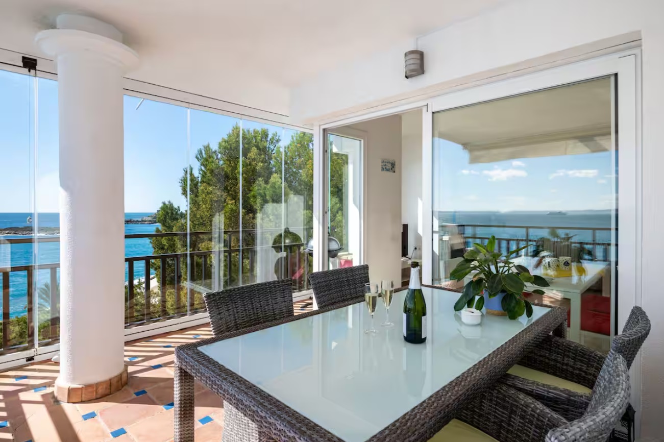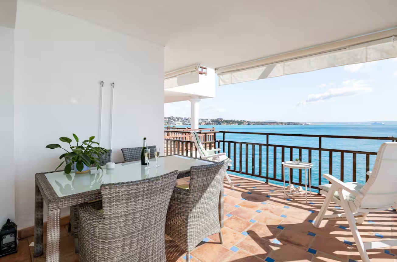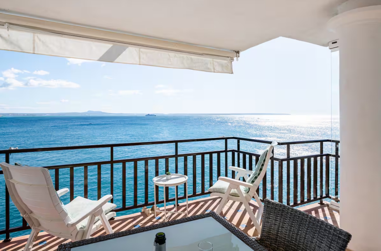 Tiene capacidad para 4 personas, viene totalmente equipado y los huéspedes se benefician del uso de todas las instalaciones del hotel: piscinas al aire libre y cubiertas, gimnasio, sala de vapor, solárium en la azotea, acceso directo al mar con un corto paseo hasta una playa de arena. El apartamento tiene una amplia sala de estar con comedor, una cocina totalmente equipada, dos dormitorios, uno principal con cama tamaño súper king, con acceso directo a la terraza y otro con 2 individuales, ambos con luces de ventilador y persianas en las ventanas, 2 baños, 1 en suite para el principal. Cuenta con una espaciosa terraza con vistas panorámicas a la bahía de Palma y está equipada con mesa de comedor, sillas y una parrilla/barbacoa eléctrica al aire libre.