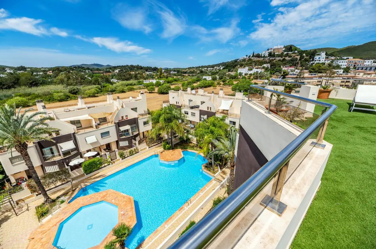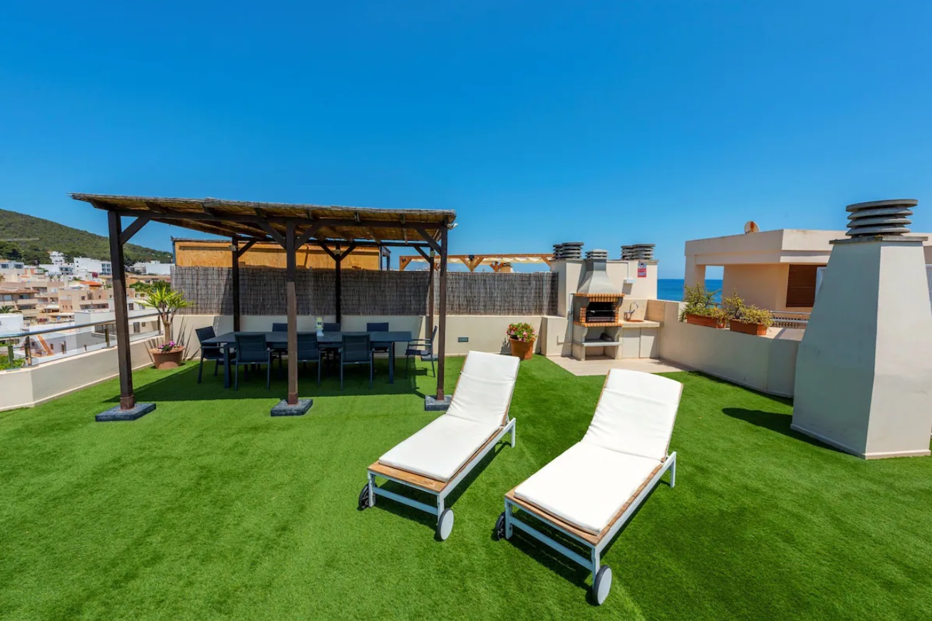 Piso con salón-comedor con cocina incorporada y salida a terraza, 3 habitaciones y 2 baños. En la parte de arriba una terraza propiedad del alojamiento y de uso exclusivo de 100 m. con espectaculares vistas, barbacoa, pérgola, mesa y tumbonas. La vivienda cuenta con calefacción y aire acondicionado. Se encuentra totalmente equipada con toallas y sabanas y menaje de primera calidad. Este excepcional piso se encuentra en una exclusiva urbanización que ofrece no solo comodidad, sino también acceso directo al encantador paseo marítimo de la playa de Santa Eulalia. Desde el momento en que entras, te reciben un espacioso salón-comedor con cocina integrada, tres acogedoras habitaciones y dos elegantes baños. La joya de esta propiedad es, sin duda, la terraza que se extiende desde el salón, proporcionando un espacio al aire libre perfecto para disfrutar de las suaves brisas marinas y las cálidas tardes ibicencas. Pero eso no es todo; en la parte superior, una amplia terraza de uso exclusivo, con 100 metros cuadrados, ofrece un rincón privado de serenidad con espectaculares vistas. Equipada con una barbacoa, pérgola, mesa y tumbonas, esta terraza se convierte en un oasis personal para relajarse o entretenerse. La propiedad está diseñada para ofrecer no solo una experiencia visualmente impresionante, sino también una comodidad excepcional. La calefacción y el aire acondicionado aseguran un clima agradable en cualquier estación del año. Además, la vivienda se presenta totalmente equipada con toallas, sábanas y menaje de alta calidad, proporcionando una experiencia residencial de lujo.