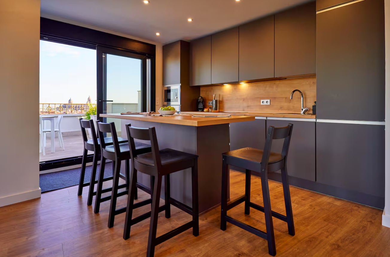 Una imponente terraza, ideal para tomar el sol y relajarse con unas vistas extraordianrias de toda la ciudad. El apartamento dispone de un gran Salón-cocina con una moderna cocina americana totalmente equipada, aire acondicionado en todas las estancias e internet wifi gratuito.