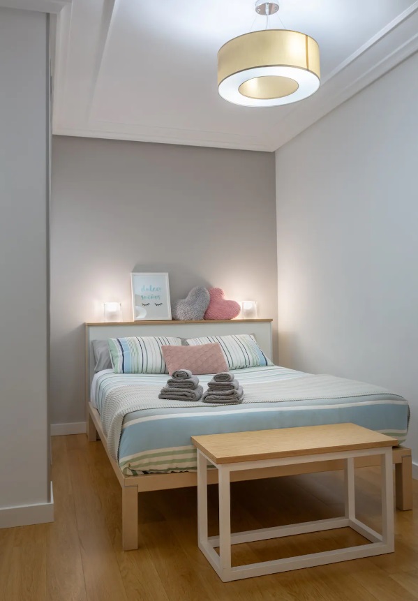 el 2º con una cama de 150x190cm, dos mesillas a cada lado de la cama, armario empotrado, sillón y una amplia ventana.
