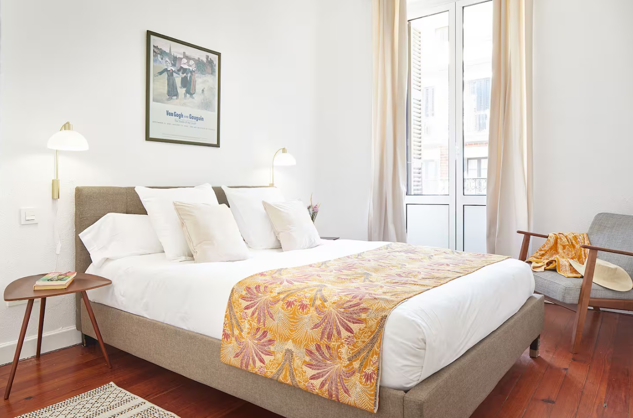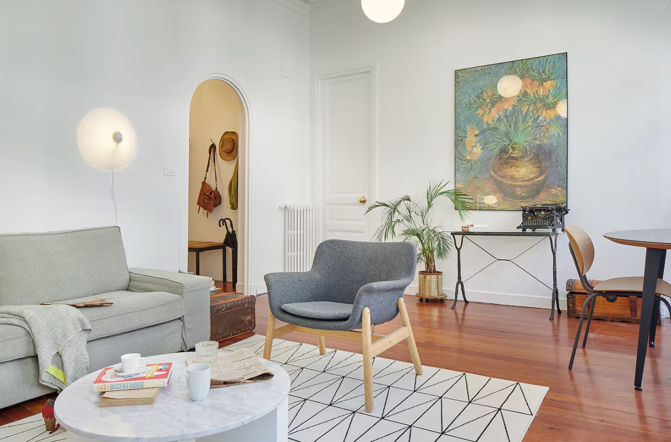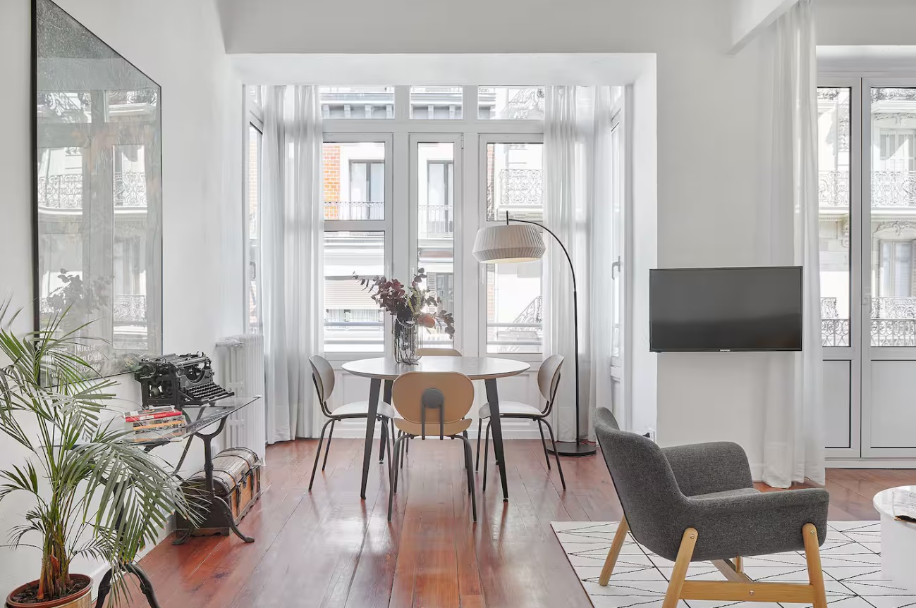 El apartamento, con una cuidada arquitectura interior, tiene un amplio salón-comedor con mobiliario de diseño. Desde el salón, se puede además disfrutar de un balcón y un mirador acristalado con vistas a la calle peatonal en la que se encuentra, junto a la famosa Avenida de la Libertad.